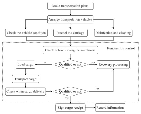 - The logistics process from port to door. As shown in Figure 4, after customs clearance and release, the vehicle transport plan can be formulated. The vehicle needs to carry out vehicle condition inspection, cleaning and disinfection, and pre-cooling of the carriage before transporting cold chain cargo. The carrier also needs to inspect the cargo before they are out of the warehouse. After passing the inspection, the vehicle will be loaded for transportation. After delivery and acceptance, the return receipt can be signed to complete the transportation outside the port. In this process, if the cargo is not qualified for the outbound inspection or delivery acceptance, the cargo will be recalled for processing and delivery cannot be successfully achieved. For cold chain cargos, out-of-port logistics require full temperature control to ensure the quality of cold chain goods.
