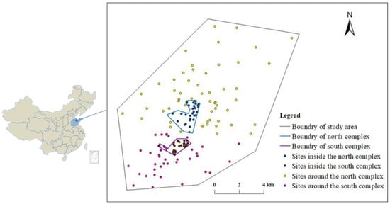 The study region covers an area of 16.65 km2, characterized by humid monsoon climate and distinct seasonality, with an annual average temperature of 16–18 °C and annual average precipitation of ~700 mm. The south and southwest winds are the dominant wind directions, followed by the north to northeast winds. The petrochemical complex has a comprehensive refining process, with a processing capacity of 13 million tons per year, and its ethylene production capacity mounts up to 800,000 tons per year. The complex mainly produces gasoline, diesel, asphalt, polyethylene, polypropylene, polyvinyl chloride, and other petrochemical products. In this study, the petrochemical complex is divided into two areas based on the origin of the crude oil used: (1) the southern zone (domestic crude oil) and (2) the northern zone (imported crude oil). Further, this study area is divided into two main parts: the area inside the complex and the area outside the complex (Table S1). The soil samples were collected according to the Technical Specification for Soil Environmental Monitoring of China (HJ/T 166-2004). The distribution of sampling points is shown in Figure 1. In terms of the grid distribution method, 37 topsoil samples (0–20 cm) within 4 km around the south complex, and 56 topsoil samples within 10 km around the north complex were collected. In total, 53 topsoil samples were collected within the complex, with 24 and 29 topsoil samples inside the south and north complex, respectively (Table S1). All the soil samples were stored in polyethylene sealable bags at −20 °C for further analysis.