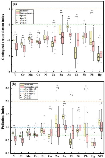 To further assess the overall pollution levels of HMs in soils, we calculated the values of Igeo and PI [,]. Figure 2a reveals the following order of the median values of the Igeo of the HMs inside the petrochemical complex: As > Zn > Sb > Ni > Pb > Mn > V > Co > Cu > Cr > Cd > Hg. Around the complex, the order of Igeo was as follows: As > Sb > Zn > Ni > Cu > Cd > Mn > Co > Pb > V > Cr > Hg. Apart from Cu, Ni, Cd, Sb, and Hg, the Igeo values of the eight HMs inside the complex were significantly higher than those around the complex (p < 0.05). The Igeo values of 22.92% of Zn, 20.75% of As, and 7.69% of Pb in soils inside the complex were within uncontaminated-to-moderately contaminated range (Table S8). Furthermore, around the complex, the Igeo values of 14.77% of Zn, 8.7% of Cd, 1.12% of Cu, and 1.1% of Sb revealed uncontaminated-to-moderately contaminated conditions (Table S8). The Igeo was calculated by local background values and correction index used to analyze natural fluctuations and underlying anthropogenic influences [], which could be used to determine the two sources of HMs: high value of Igeo indicating obvious anthropogenic source []. Based on the results mentioned above (at uncontaminated-to-moderately contaminated level around the complex), HMs around the complex were not only from natural sources, but also anthropogenic sources, such as petrochemical production [].