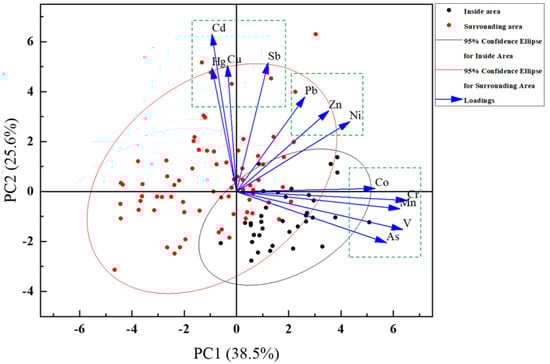 Principal Component Analysis (PCA) was performed to give assistance to further identify the potential sources of the 12 HMs inside and around the petrochemical complex area. Three principal components were obtained with eigenvalues > 1, accounting for 38.5%, 25.6%, and 11.4%. The first principal component (PC1) and second principal component (PC2) were considered in this study, which together accounted for 64.1% of the total variance. The score plot is shown in Figure 3: the sampling sites inside the complex were clearly separated from those around the complex and mainly scattered in the first quadrant, indicating that PC1 mostly represented the petrochemical pollution source, while PC2 represented other sources. Furthermore, 94.4% of soils inside the complex and 32% of soils in surrounding areas were primarily affected by PC1, indicating that they were mainly influenced by petrochemical production activities.
