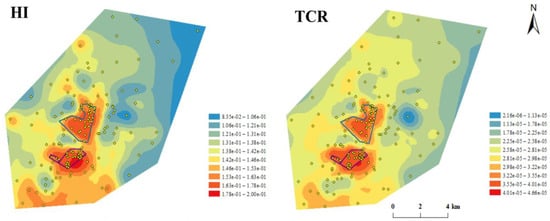 Compared with the spatial distribution of HM contents, the spatial distribution of human-health risks is more worthy of attention. The estimated level maps for HI and TCR of all HMs are shown in Figure 4. HI and TCR showed similar patterns in spatial distribution. Both carcinogenic and non-carcinogenic risks showed higher levels in the petrochemical complex than those in the surrounding areas. With the increase of the distance from the complex, both carcinogenic and the non-carcinogenic risks showed downward trends, indicating that the health risks in the study area mainly attributed to the petrochemical complex. Particularly, due to the impact of petrochemical downstream enterprises, higher carcinogenic and non-carcinogenic risks were also observed in the southeast part of the surrounding area, which is consistent with the relatively high concentration of all HMs in this area in the estimated concentration maps.