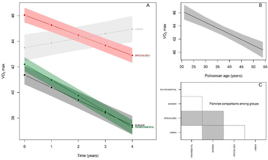 VO2max behavior of police officers over the years. (A): Changes in VO2max performance over 5 years according to police specialties; (B): VO2max performance achieved by police officers in relation to age; (C): Comparison of VO2max achieved between police specialties at baseline (gray color indicates significant difference between the respective groups).