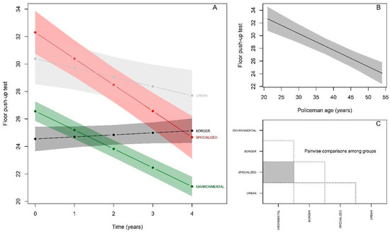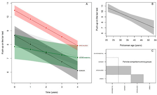 The performance in the pull-ups test showed similar behavior to the other tests at baseline, where the Specialized group was the only one that presented a statistically significant superior performance, (βspecialized = 2.63; p < 0.05), while the Border and Urban groups presented performances equivalent to the reference group (Environmental) (βborder = 0.80; p > 0.05 and βurban = 0.69; p > 0.05), (Figure 5; Table 5). The reference group did not show a significant annual decline in the number of repetitions performed in the test (β = −0.20 p > 0.05). There was interaction with all groups, with the Specialized group showing a significant decline in performance (−0.63 βspecialized:time = −0.43; p < 0.05), and the Border and Urban groups remained equivalent to the performance of the Environmental group, without significant differences (−0.63; βborder:time = −0.43; p > 0.05); (−0.35; βurban:time = −0.15; p > 0.05). Regarding the effect of age, there was a significant decline of −0.11 repetitions performed by police officers per year (p < 0.05) (Figure 5B). The post-hoc comparison behavior between the groups starting from the baseline was as follows (Figure 5C): Environmental ≠ Specialized; Specialized ≠ Urban; Specialized ≠ Border.