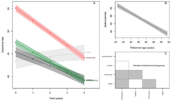 Figure 6 and Table 6 present the statistical results for the Sit-ups test. It can be observed that at baseline the Specialized group again presented better performance (βspecialized = 7.64; p < 0.05), while the Urban group presented lower performance (βurban = −4.00; p < 0.05) and the Border group presented performance equivalent to the reference Environmental group (βborder = −2.06; p> 0.05). A significant annual decline in the number of repetitions performed in the test (β = −2.08; p < 0.05) was observed for the Environmental group. There was interaction with all groups, and the Specialized group showed a significant decline of −2.73 repetitions (βspecialized:time = −0.65; p < 0.05), while the Urban group showed a significant improvement in performance + 0.47 repetitions; (βurban:time = 2.55; p < 0.05), and the Border group remained equivalent to the reference group, with no significant difference, with −1.55 repetition; (βborder:time = 0.53; p > 0.05). Considering age, the results show that with each passing year, police officers perform 0.56 fewer repetitions (p < 0.05) (Figure 6B). The post-hoc comparison between the groups starting from the baseline behaved as follows (Figure 6C): Environmental ≠ Specialized; Environmental ≠ Urban; Specialized ≠ Urban; Specialized ≠ Border.
