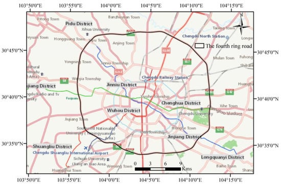 Chengdu city is the capital of Sichuan Province, China. The total area of Chengdu city is 14,335 square kilometers. The eastern region of Chengdu is the hinterland of the Chengdu Plain, with elevations generally above and below 750 m and the lowest elevation at 359 m. In 2014, the number of passenger trips by taxis in Chengdu was 253.25 million, the number of passengers carried was 429.62 million, and the mileage operated was 221.505 million kms []. The taxis’ trajectory data involved in this paper were mainly distributed within the area of the Chengdu Belt Expressway (also known as the Fourth Ring Road). The location of the study area is shown in Figure 1.