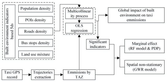 To this end, we investigated the marginal effects and spatial heterogeneity of the built environment’s effects on taxicab traffic emissions by applying the least squares regression (OLS) model, the geographically weighted regression (GWR) model, the random forest (RF) model, and the partial dependence plot (PDP). Consequently, the results will benefit our understanding of the mechanism of the built environment’s influence on traffic emissions and provide guidance for low-carbon-oriented built environment planning.