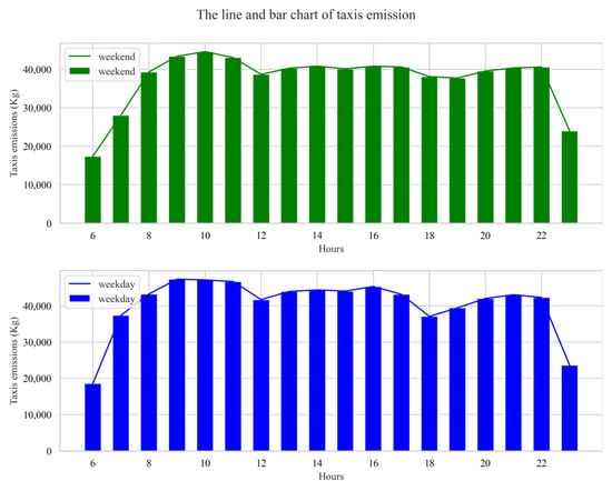 The total taxis’ emissions between 06:00 am and 23:00 pm on weekdays were 193,729.82 kg, of which CO pollutant emissions were 123.53 kg, NOX pollutant emissions were 51.40 kg, HC pollutant emissions were 8.37 kg, and CO2 pollutant emissions were 193,546.52 kg. The total taxis’ emissions between 06:00 am and 23:00 pm on weekends were 172,721.87 kg, of which CO pollutant emissions were 117.06 kg, NOX pollutant emissions were 44.86 kg, HC pollutant emissions were 7.72 kg, and CO2 pollutant emissions were 172,552.22 kg. It can be seen that the emissions of four pollutants were greater during weekdays than during weekends. We speculated that the reason may be mainly due to the more random travel behavior and higher average taxi travel speed during weekends. As we know, compared to weekdays, residents’ travel behavior on weekends is not constrained by commuting, the destinations of travel are more diverse, and the distribution of travel behavior over time is characterized by more randomness. Of course, the results in this paper are only based on sample data collected in two days, which may have the problem of small sample size. However, our finding about the temporal characteristic of taxis’ pollutant emissions is similar with a study performed by Liu et al. over a period of 9 days (22–30 June 2015) in Hangzhou, China []. The estimated hourly pollutant emissions from taxis during weekends and weekdays (represented by 3 and 4 August 2014, respectively) are shown in Figure 3.