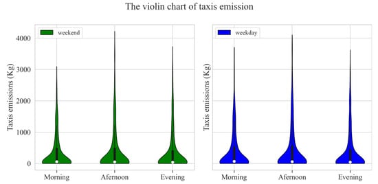 As can be seen from Figure 3, taxis’ emissions exhibited very similar characteristics on weekdays and weekends. In order to avoid redundancy, the time characteristics of emissions will be analyzed using weekends as an example. First, emissions from taxis increased rapidly between 06:00 am and 10:00 am, peaking at 10:00 am. Then, it decreased between 10:00 am and 12:00 am. Moreover, emissions remained relatively stable between 13:00 pm and 18:00 pm, with a peak at 16:00 pm during this period. Finally, emissions continued to rise slightly between 19:00 pm and 22:00 pm, and then dropped sharply at 23:00 pm. To facilitate the analysis, 06:00 am to 23:00 pm was divided into three time periods: morning (06:00 am to 12:00 am), afternoon (12:00 am to 18:00 pm), and evening (18 pm to 23:00 pm). The emissions in the three periods were calculated and the resulting violin diagrams are illustrated in Figure 4.