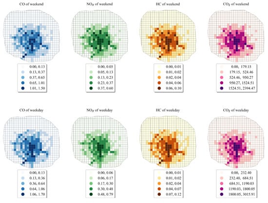 As can be seen from Figure 4, there were similarities and differences in the statistical distribution of emissions in the three time periods during weekends and weekdays. The total taxis’ pollutant emissions of more than 50% of TAZ units in the study area were less than 100 kg and more than 75% of TAZ units were less than 700 kg. Among the three time periods, the emission distribution was the most discrete in the afternoon period and the emission peak value was the largest among the three time periods. During the weekend, the peak emissions in the morning period were the smallest among the three time periods. During weekdays, the peak emissions during the evening period were the smallest among the three time periods. Taxis’ pollutant emissions were significantly lower during weekend mornings compared to weekdays. These results revealed the characteristics of taxi traffic behavior of Chengdu residents at different time periods during weekdays and weekends. In addition, these results are similar with Zhang’s study in Beijing, China. In detail, Zhang et al. found that the spatiotemporal carbon emissions and travel patterns in Beijing, China differ between weekdays and weekends, especially during morning rush hours []. In order to further reveal the differences in taxis’ pollutant emissions throughout the day for each TAZ unit, the spatial distribution of taxis emissions on weekday and weekend are illustrated in Figure 5.