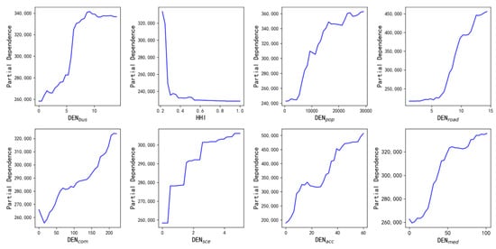 The RF regression analysis was performed using eight significant variables to obtain importance rankings of independent variables and plot PDPs. First, all sample data were divided into a training set and a test set in the ratio of 9:1. Then, the GridSearchCV function was applied to the training set to obtain the best model estimation. The specific parameters of the best model estimation were as follows: number of estimators was 700, max_depth was 10, oob_score was false, and bootstrap was true. Finally, the best model estimation was applied to the sample set for regression analysis. The adjusted R2 of the regression result was 0.884, which was significantly higher than the result of the OLS model. The ranking of the importance of eight independent variables was consistent with the ranking of coefficients (absolute values) in the OLS model results. The PDP diagrams of the effects of eight built environment indicators on traffic emissions are shown in Figure 6.