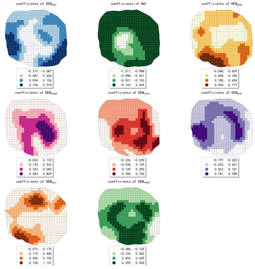 As can be seen from Table 6, the standard deviation of estimated coefficients for eight built environment indicators were higher than 0.1, besides the DENsce. It can be inferred that the estimated coefficient values of indicators are statistically discrete. In other words, the spatial variations in the effect of the urban built environment on taxis’ pollutant emissions were significant. The indicator with the greatest degree of spatial variation in its effect was HHI, and the smallest was DENsce. The estimated coefficients map of eight built environment indicators is shown in Figure 7.