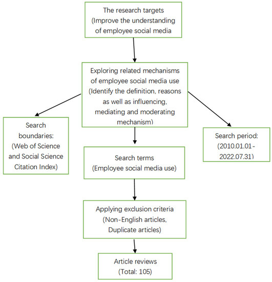 With the rapid development and widespread popularity of the Internet, the use of social media by employees at work has become an increasingly common phenomenon in organizations [1]. Because of the unique advantages of improving the convenience of information transfer and work organization efficiency, companies prefer to incorporate typical social media such as WhatsApp, Zoom and MS Teams, and other Internet office systems into their daily management practices. The use of social media by employees in the workplace has a significant impact on the way employees interact and share information with each other and with the organization, so there have been extensive academic studies in recent years [2]. Studies on the factors influencing employees’ social media use have been conducted in different aspects such as individual, work, technology, and organizational contexts [3]. In terms of the consequences of the impact of employee social media use, this behavior can have positive effects on organizations, such as increasing employee job involvement and organizational citizenship behavior [4,5]. Meanwhile, the findings of Kwahk and Park [6] also indicated a significant positive effect on job performance. However, not all the findings are positive, and some scholars have expressed concerns. For example, if employees use social media for recreational and social purposes for long periods of time, it will significantly crowd out time resources for work, which will seriously harm the productivity of the company [7]. In addition, employees may also use the job connections brought about by social media use to seek new positions, thus increasing employee turnover [8]. Cao and Yu [9] showed that excessive use of social media by employees can cause a certain amount of psychological stress to employees and thus reduce job performance. This shows that this behavior has a positive impact on the organization as well as a negative effect. In addition, although some results have been achieved in academic research on employee social media use, there are still some problems. Chu [10] systematically analyzed the articles on the relationship between the use of social media and employee performance from 2009 to 2018 with the method of meta-analysis, but there are no recent studies from 2020 to 2022. Sun et al. [11] mainly focused on the dark side of social media use and emphasized the conflicts brought by employees’ use of social media, but there are no reviews objectively evaluating the consequences of employees’ use of social media from both positive and negative aspects. van Zoonen et al. [12] classified relevant literature according to individual behavior theory, social behavior theory, and communication theory, but no paper built a comprehensive model to clearly show the research background and frontier development in this field. Therefore, it is necessary to clarify the development and problems of employee social media use research through a systematic review so as to promote the deepening and development of this research area. In summary, in order to further promote the development of the research, this paper uses a systematic literature review method to sort out the definition, types, research methods, after-effects mechanisms, mediating mechanisms, and moderating mechanisms of employee social media use based on the review of existing research results and comprehensively elaborates the research lineage and cutting-edge development of employee social media use from 2010 to 2022 and constructs an integrated model. On this basis, the paper further identifies the key issues in the current study and possible future research directions.
