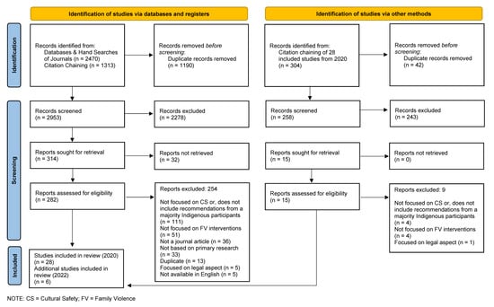 The included search terms for the database searches were derived from three concepts: “Indigenous”, “cultural safety”, and “family violence”. These search terms were expanded using synonyms, related terms, and Boolean operators. University of Alberta “Indigenous Peoples (Canada)” search filters available for the specific databases were used to supplement the search terms for “Indigenous”, for example, by including specific Indigenous or Tribal names []. The search terms were further expanded upon using subject headings and keywords specific to each database. An example list of search terms for specific databases can be found in Appendix A. Following the database searches, relevant Indigenous journals not found in the databases were hand-searched for eligible articles from inception until the search date, from 18 June to 30 June 2020. A list of Indigenous journals and related search terms can be found in Appendix B. Forward (i.e., screening papers who have cited our included studies) and backward (i.e., reference checking) citation chaining of included sources were completed to capture articles that may have been missed by the database searches and the hand review of relevant journals.