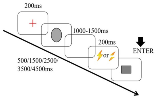 Electrical stimulation was applied to the participants using a multi-channel electrical stimulator, which entailed placing the Velcro strap of an electrode on the middle finger of their dominant hand. The intensity of the shock was adjusted by controlling the voltage value of the electrical stimulator. A common 1–4 s latency window (i.e., 1–4 s after a stimulus was introduced) was selected, with a standard minimum amplitude of 0.05 s [29]. For analysis purposes, the participants’ EDA responses were corrected based on their EDA values prior to stimulation. These data were subsequently converted to square roots to standardize response amplitude data [30] and were averaged for each type of test. Each participant was required to complete an electrical-stimulation-threshold procedure developed by Crockett [31] before the experiment, which ensured that a gradually enhanced electrical stimulation matrix could be obtained. The procedure obtained 20 different voltage intensities (from weak to strong) generated by each participant based on their perceptions. Before the formal experiment, each participant measured the sensory threshold of shock intensity and subjectively assessed the psychological perception of shock intensity through a nine-point rating scale (one meant no aversion; nine meant very disgusted). The score voltage intensity of the points between one and three was defined as low shock intensity, and the voltage intensity between six and nine points was defined as high shock intensity. Participants selected shock intensity levels ranging from 0.1 mA to 6.4 mA. The additional computer was used to generate electric shocks and record the EDA using LABChart.(ADInstruments Pty Ltd., Bella Vista, Australia)