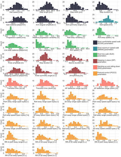 Distributions and statistics presented in this section were produced using only data that passed quality control, performed by one trained researcher. Discard rates (3.2–15.0% depending on task) and reasons for exclusion are provided in supplementary Table S1. The normative values are distributed highly variable (Figure 2): SCSW gait speed, for instance, is approximately normally distributed, while other parameters such as SLW roll sway speed are highly skewed or feature outliers. Respective descriptive statistics are provided in Table 3.