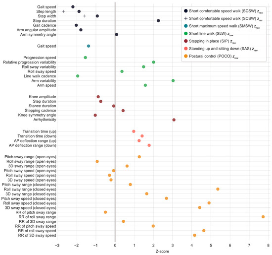 Usage of the provided normative data was exemplified for data from a person with multiple sclerosis (Figure 3). The illustration of z-score transformed values allows for straightforward overview of individual patterns, and cross-checking whether findings from the literature apply for the individual at hand. For instance, the person in Figure 3 shows above (healthy) average POCO pitch/roll/3D sway speed with closed eyes and below average SMSW gait speed, which has been likewise found at group level in pilot studies using Motognosis Labs and the Kinect v1 (healthy participant overlap with Valkinect and VIMS: n = 9) [26,27].