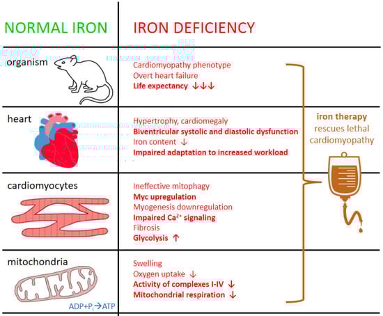 - Hoes, M.F.; Grote Beverborg, N.; Kijlstra, J.D.; Kuipers, J.; Swinkels, D.W.; Giepmans, B.N.G.; Rodenburg, R.J.; van Veldhuisen, D.J.; de Boer, R.A.; van der Meer, P. Iron deficiency impairs contractility of human cardiomyocytes through decreased mitochondrial function. Eur. J. Heart Fail. 2018, 20, 910–919. [Google Scholar] [CrossRef] [PubMed]