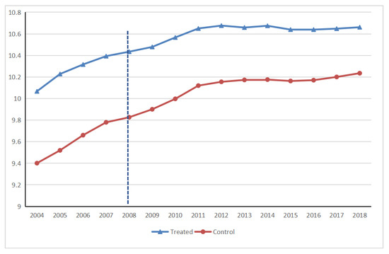 The results of the common trend test are shown in Figure 1. As shown, the carbon emissions of treatment groups are larger than that of the control groups. The treatment groups and the control groups have consistent developing trends before 2008, and the gap between the two groups gradually narrows after 2008, indicating that the regression results are robust to a certain extent.