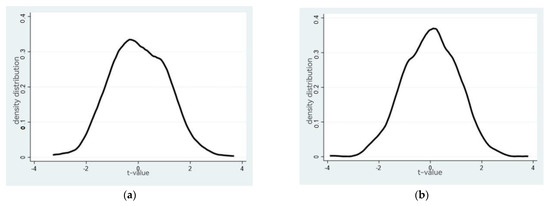 Owing to the limitation of the cognitive level and available data, existing selection biases and some important variables for the empirical model being missing could lead to serious endogeneity. Considering the possible selection biases, the propensity score matching method is applied to test the endogeneity by taking the control variable as the covariate, and the nearest neighbor matching method is used in a 1:1 ratio to match. Then, a new benchmark regression is performed based on the new control variables and testing the potential endogeneity. We also control the endogeneity using a placebo test. Current research on the placebo test of panel data usually adopts regional randomization or regional–temporal randomization. The latter scheme is adopted for the placebo test in this paper, as the air pollution control auditing is conducted asynchronously.