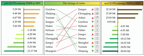 The amount of net ECEs−IPT among the YREB in 2007 and 2017.