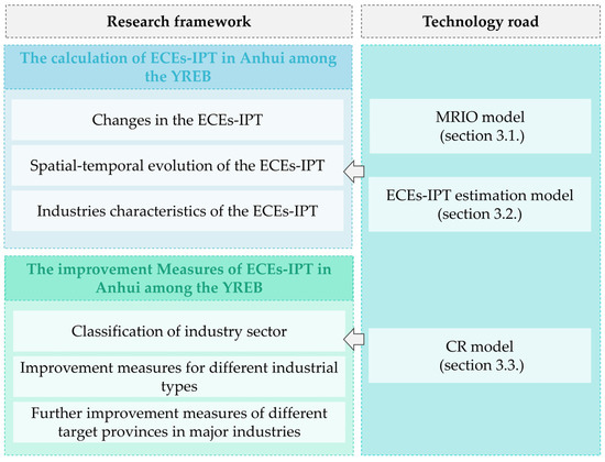 This research was based on the China regional expansion input–output (IO) table in 2007 and 2017, used MRIO model (Section 3.1) and ECEs-IPT estimation model (Section 3.2), calculated the amount of ECEs-IPT in Anhui among the YREB, analyzed the spatial–temporal evolution pattern of ECEs-IPT, and revealed the industrial characteristics of ECEs-IPT. On this basis, we established a coupling relationship (CR) model (Section 3.3) to classify the industry sectors and proposed the improvement measures for different industrial types (Figure 4).