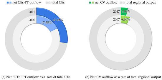 The net ECEs-IPT outflow in Anhui among the YREB as a rate of the total CEs in Anhui increased from 17.58% in 2007 to 27.08% in 2017 (Figure 5a), with an average annual growth rate of 9.56%, while the net CV outflow in Anhui among the YREB as a rate of the total regional output in Anhui decreased from 6.60% in 2007 to 3.80% in 2017 (Figure 5b).