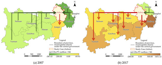 Spatial–temporal evolution of the net ECEs-IPT outflow in Anhui among the YREB from 2007 (a) to 2017 (b).