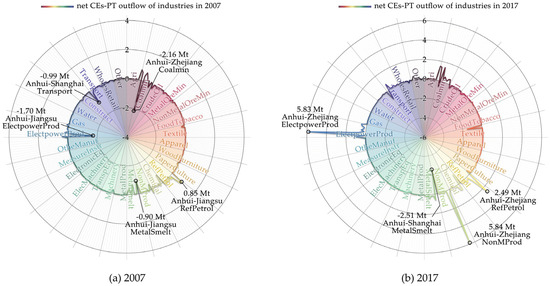Net ECEs-IPT outflow of industry sectors in Anhui among the YREB from 2007 (a) to 2017 (b).
