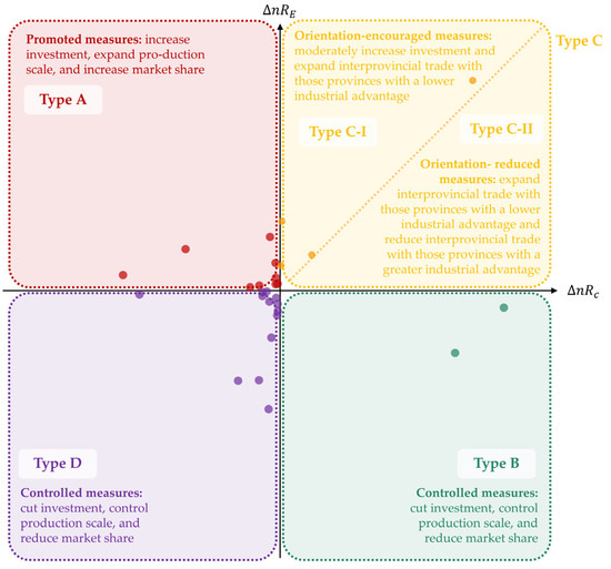 After calculating the and ( of each industry sector; we divided sectors into four types, with five subtypes according to the coupling relationships between them, as follows: Type A ( > 0 and < 0); Type B ( < 0 and > 0); Type C ( > 0 and > 0), includes Type C-I ( > > 0) and Type C-II ( > > 0); Type D ( < 0 and < 0). Based on the above analysis, we proposed improvement measures for the different sectors characterized by different types: Type A should implement the promoted measures; Type B and Type D should implement the controlled measures; Type C-I and Type C-II should implement the orientation-encouraged and orientation-reduced measures, respectively.