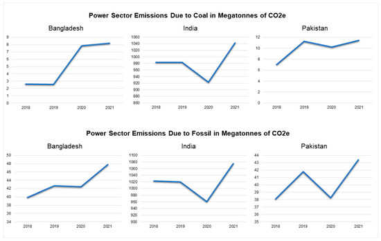 Between 2018 and 2021, the power sector emissions due to coal first decreased from 2.62 (2018) to 2.56 (2019) megatons of CO2 but increased to 8.18 megatons of CO2 by 2021 in Bangladesh [43]. In India, the emissions due to coal use decreased between 2018 and 2020 from 983.07 (2018) to 923.13 megatons of CO2 and increased marginally to 1042.33 megatons of CO2 [43]. In Pakistan, the emissions overall increased from 6.99 (2018) to 11.42 (2021) megatons of CO2, but there was a slight shift from 11.24 (2019) to 10.19 (2020) megatons of CO2 [43] (Figure 1).