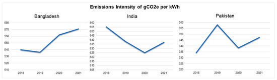 The emissions intensity of CO2 per kWh increased from 539.876 kWh (in 2018) to 570.985 kWh (in 2021) in Bangladesh [43]. In India, on the other hand, there was a decline from 655.366 kWh in 2018 to 637.182 kWh in 2021 [43]. Pakistan saw a steady rise from 334.351 kWh in 2018 to 358.056 kWh in 2020 and an increase to 347.26 kWh in 2021 [43] (Figure 2).