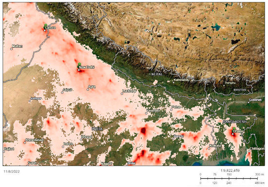 GIS mapping of low air quality geographic ‘spots’ in the South Asian region. The GIS image was generated on 11/8/2022, with data sources comprising the European Commission, European Space Agency, Esri, and the UKRI GCRF South Asian Nitrogen Hub [44,45].