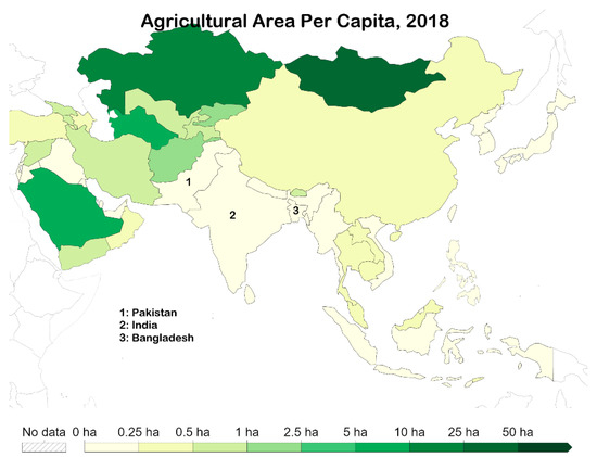 The map is scaled in nine points (1 = 0–0.25 ha; 2 = 0.25–0.5 ha; 3 = 0.5–1 ha; 4 = 1–2.5 ha; 5 = 2.5–5 ha; 6 = 5–10 ha; 7 = 10–25 ha; 8 = 25–50 ha; 9= >50 ha) [46] (Figure 6). All three countries fell under category 1, with agricultural land per capita between 0–0.25 ha [46]. The highest of the three was Pakistan, with 0.17 ha per capita [46]. This was followed by India with 0.13 ha per capita [46]. Finally, Bangladesh had 0.06 ha per capita [46] (Figure 6).