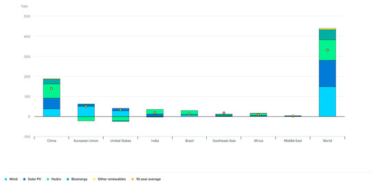- IEA. Annual Growth of Renewable Electricity Generation by Region and Technology. 2019. Available online: https://www.iea.org/data-and-statistics/charts/annual-growth-of-renewable-electricity-generation-by-region-and-technology-2019 (accessed on 10 November 2022).