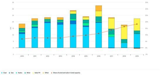 Annual power sector capacity additions in India, 2010–2019 [48].