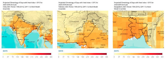 Projected Climatology of Days with Heat Index >35 °C for 2020–2039 (Annual) [49]. Annual projections for the years 2020–2039 are made for the heat index (>35 °C). A reference period of 1995–2014 was utilized. The SSP1–1.9, multi-model ensemble was utilized. The projections are scaled for 365 days as depicted in the figure.