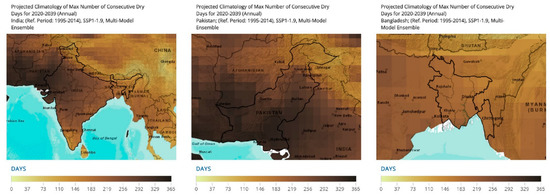 Dry days are defined as any days where the daily accumulated precipitation is less than 1 mm. The indicator represents the maximum length of dry spells that are computed sequentially for the entire time series and takes into account the maximum value each month during the data period. Consecutive dry days aid us in understanding the changing precipitation patterns and the changing periods of aridity for the location. The identified national units reflect the trends for the projected period until 2039 [49] (Figure 10).