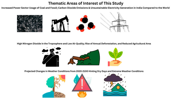 In this paper, we studied the indicators of climate change that ascertained both causation and effect. The first key aspect comprised the power sector’s use of coal and fossil along with emissions of carbon dioxide. The second central finding related to the geographic mapping of areas with nitrogen dioxide tropospheric column mapping and indicators of the AQI; this was further supported by annual deforestation and agricultural area per capita in the region. Thirdly, power sector and electricity generation trends in India, Southeast Asia, and the world were extrapolated. Lastly, projected weather changes in the heat index (days surpassing 35 °C) and consecutive dry days until 2039, and the annual SPEI drought index for the years 2020–2100 were presented.