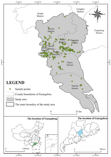 Guangzhou is located between 112°57′ and 114°3′ east longitude and 22°26′ and 23°56′ north latitude. It has six months of summer per year and a subtropical climate [26]. Guangzhou is a central city in southern China and has a large concentration of urban villages, mainly in the Huangpu, Tianhe, Liwan, Haizhu, and Baiyun districts. The results of the seventh census show that there are new trends in population movement [27]. Areas with large population inflows can experience increasing conflicts between energy supply and demand. The 10 cities with the fastest growing populations in China in 2020 were Shenzhen, Chengdu, Guangzhou, Zhengzhou, Xi’an, Hangzhou, Chongqing, Changsha, Wuhan, and Foshan, with a total population of 158 million, 42.1 million more than in 2010. Their share of the national population is projected to increase from 8.7% in 2010 to 11.2% in 2020. Figure 1 shows the location of Guangzhou and Guangdong Province in China.
