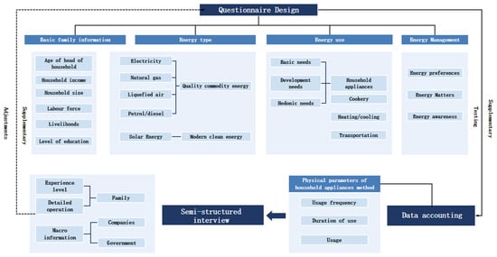 A total of 247 valid samples were collected using field research sampling and in-depth interviews in urban villages in Guangzhou in 2020. Stratified random sampling was used. The survey included basic household information, kitchen equipment and household appliances, electricity, transportation, and housing consumption. The average age of the respondents was 32.5, with the youngest being 18 years old and the oldest being 60 years old. In terms of gender, 47.77% were female and 52.23% were male. In terms of occupation, most of the respondents were office workers, general workers, and freelancers, accounting for 62.34%, and the average education level of the respondents was tertiary level. The chart below shows the structure of the questionnaire design (Figure 2) [28].