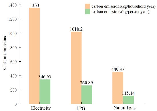 The main types of energy used by residents in urban villages in Guangzhou are electricity, LPG, natural gas, and others. Of the 247 households surveyed, 44 households used natural gas for cooking, 145 households used tank gas, 52 households used electricity, and 6 households used other fuels. In terms of average household carbon emissions, electricity emissions averaged 1352.99 kg/household.year, and LPG and natural gas emissions averaged 1467.56 kg/household.year. The total direct household carbon emissions were 2820.55 kg/household.year. Electricity, LPG, and natural gas accounted for 47.97%, 36.1%, and 15.93% of direct carbon emissions, respectively, with electricity consumption being the main household energy carbon emission. In terms of annual per capita carbon emissions, electricity emits 346.67 kg > LPG 260.89 kg > natural gas 115.14 kg. Figure 3 shows the separate CO2 emissions.