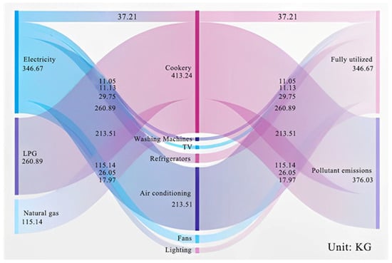 First, it is known that residents of urban villages use commodity energy. A calculation of the carbon emissions per capita of household energy shows that the carbon emissions per capita of electricity are 346.67 kg, mainly for cooking, refrigeration, and home appliances. The per capita carbon emissions from cooking were 37.21 kg, from household appliances, 95.95 kg and from refrigeration, 231.51 kg, accounting for 61.59% of the total carbon emissions from electricity, which shows that air conditioning and refrigeration are the main causes of carbon emissions from electricity. In contrast, LPG produces 260.89 kg of carbon emissions per capita and is mainly used for cooking. Natural gas produces 115.14 kg of carbon emissions per capita and is also mainly used for cooking. LPG is an important source of cooking energy, accounting for 63.13% of cooking carbon emissions. Finally, from the perspective of the end consumer, cooking produces the most air pollutants because it employs a relatively diverse energy mix used for cooking. Constructing the household per capita carbon emissions energy flow offers a clearer understanding of the structure and use of household per capita carbon emissions.