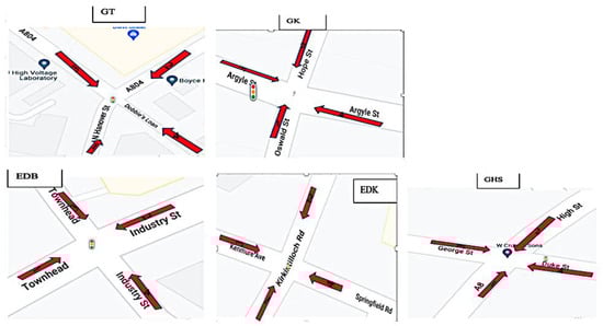 Monitoring locations used for noise measurement included five major urban traffic road junctions close to around 500 residential areas. These locations were selected using feedback from the air quality monitoring data and major-traffic road sites (with perceived high-traffic noise and air pollution data) based on urban background criteria []. To locate monitoring locations for air pollutants as efficiently as possible, noise sampling sites were chosen using a location-allocation model. The study incorporated land use, road networks, population density, and regulatory air-quality monitoring. The study focused on the directions of traffic flow at the monitoring sites (Figure 2 and Figure 3). These places are;