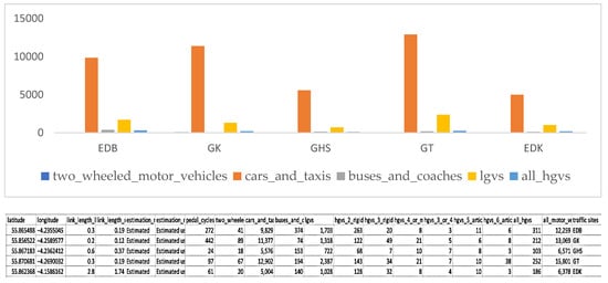 Data was taken on the annual daily road traffic flow of Car and taxi vehicles, Two-wheeled motor vehicles, Light-goods vehicles (lgvs), Buses and coaches, and all heavy goods vehicles (all hgvs) at each of the sites (Glasgow High Street, Glasgow Townhead, East Dunbartonshire Bishopbriggs, East Dunbartonshire Kirkintilloch, and Glasgow kerbside) during the monitoring period from the department of transportation (road traffic statistics) on road traffic flow [].