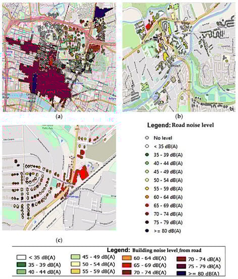 Buildings are labelled with different colours based on the amount of noise produced by the road. Maximum noise level is recorded at the various locations of the facades of buildings located at the intersection and areas along the route. Our findings show that the annual (Lden) noise level of some of these structures is at the highest level at GK, GHS, and EDB, exceeding 80 dB(A), as shown in Figure 5a,c. However, as shown in Figure 5b, the EDK max level was between 65 to 69 dB(A), and during peak hours, buildings near crossings are subject to noise levels exceeding 80 dB(A). This finding concludes that the residents in the areas are loud, and noise on the facade of evaluated facilities should not exceed 65 dB(A) according to Scotland’s regulatory standards. Due to their location along the city’s busiest roadways, the analysed buildings are the most endangered by noise.