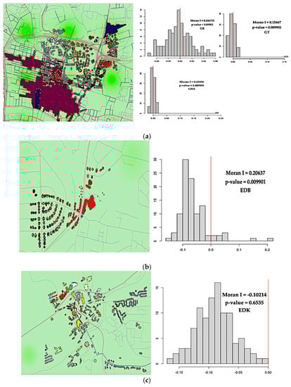 On the other hand, as shown in Figure 7c, there was a negative spatial autocorrelation but not statistically significant because their p-values were not lesser than the significance level of 5%. The p-value is 0.6535, indicating there was dispersion in the map. The plot shows the distribution of Moran’s I values, and the red vertical line shows our observed Moran’s I value of −0.10214. The p-value provided by the MC simulation was 0.65, indicating a less than 1% risk of rejecting the null hypothesis incorrectly or a less than 1% chance that our observed pattern is consistent with a random process. Therefore, road traffic noise (Lden) is not influenced by NO2, PM10 and PM2.5 at the EDK monitoring locations.