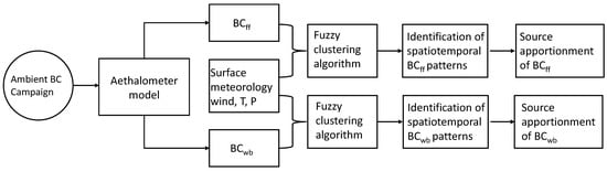 In a previous publication [36], we used bivariate plots and k-means clustering of ambient PM2.5 and PM10, along with receptor model results, to estimate major sources contributing to ambient PM in urban areas; this methodology works best when one or two sources are the major contributors to ambient concentrations. However, this approach has two limitations: (i) the bivariate plots accept only pairs of meteorological variables to analyze ambient PM concentrations, (ii) the clustering technique is hard, that is, each hourly observation may belong to only one cluster (source). To improve the flexibility of that analysis, the meteorological input variables were increased to four: wind speed, wind direction, temperature, and pressure. But the key improvement is to use a fuzzy clustering algorithm, so each hourly observation may belong to more than one (fuzzy) cluster, using the probabilistic concept of cluster membership [37]. The proof of the concept of this new approach (denoted as FUSTA: FUzzy SpatioTemporal Apportionment) was developed for ambient SO2 in an industrial zone, where it was shown that spatiotemporal patterns obtained from FUSTA were like the ones obtained by air quality modeling of the major SO2 emission sources in the study zone [32]. This was the rationale for hypothesizing that FUSTA could resolve local and non-local sources of BCff and BCwb because these are inert tracers of combustion sources, so they are only subject to atmospheric transport and deposition. Below we summarize the major steps needed to carry out such a methodology for the case of black carbon.