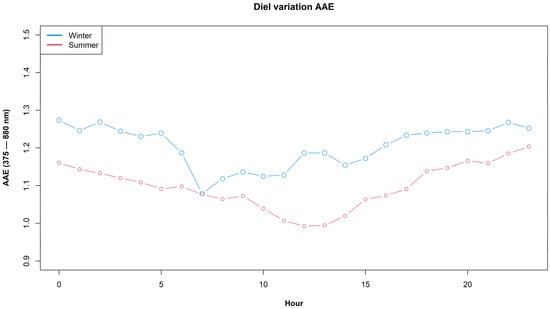 Figure 2 shows the diel profiles of AAE for the austral summer and winter months. The winter mean value is significantly higher than the summer value (t = 11.9, p-value < 2.2 × 10−16), which suggests that wood-burning contributions to AAE increase in winter because of residential space heating in the city, a well-known source of ambient PM2.5 in Santiago [44].