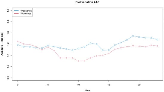 Figure 3 shows a comparison of diel profiles of AAE for workdays and weekends. During weekends, the AAE mean value is significantly higher than in the case of workdays (t = 7.64, p-value = 2.8 × 10−14); this suggests a higher consumption of wood burning on weekends and thus the increase in AAE values.