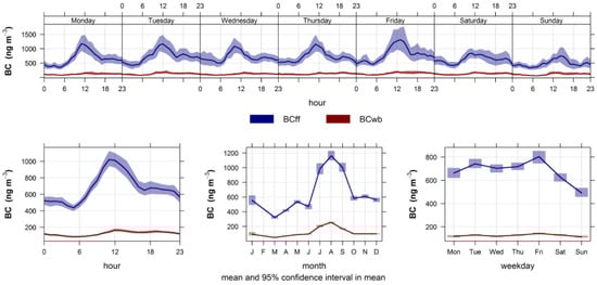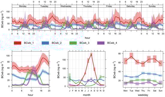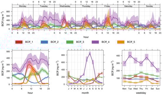 Figure 4 shows the time variability for BCff and BCwb contributions estimated from the aethalometer model. BCff is the dominant contribution to total BC all year long; this contribution decreases over weekends, as expected from the traffic activity variability in the city. From Table 1, it follows that, on average, BCff accounts for 85% of total BC. Regarding BCwb contribution (see Figure A3), it rises in winter months, as expected, and it does not decrease over weekends since it comes from residential sources. This contribution does not vanish in the spring and summer seasons; this is explained by wildfires and agricultural burning sources at the regional scale; they have been found in Santiago using receptor modeling of ambient PM2.5 combined with satellite images [45].
